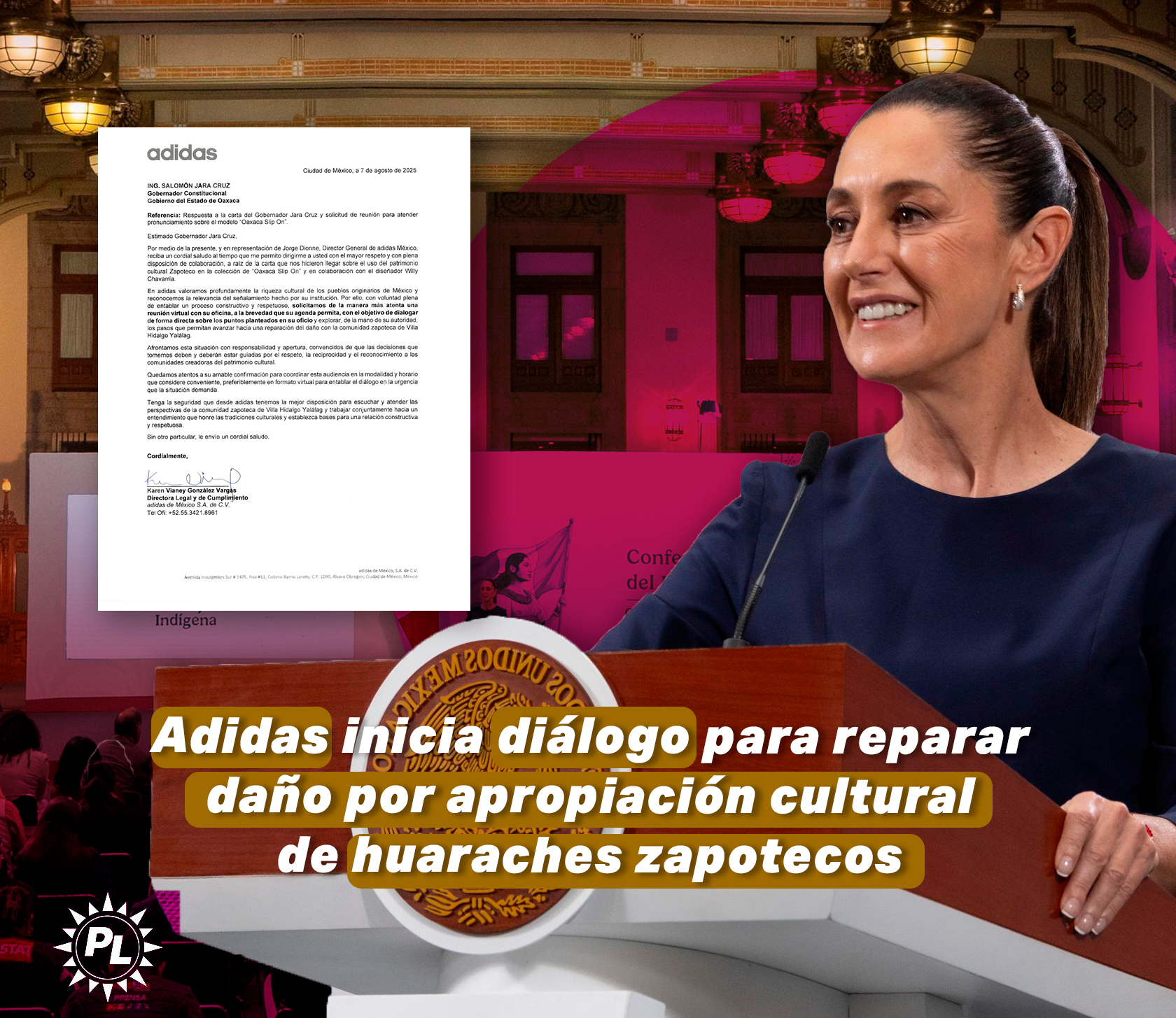 La presidenta Claudia Sheinbaum Pardo confirmó que la empresa Adidas ya estableció comunicación con el Gobierno de Oaxaca para iniciar un proceso de reparación hacia la comunidad zapoteca de Villa Hidalgo Yalálag, luego de que la firma comercializara el modelo de calzado “Oaxaca Slip-On”, inspirado en los tradicionales huaraches de la región, sin autorización.