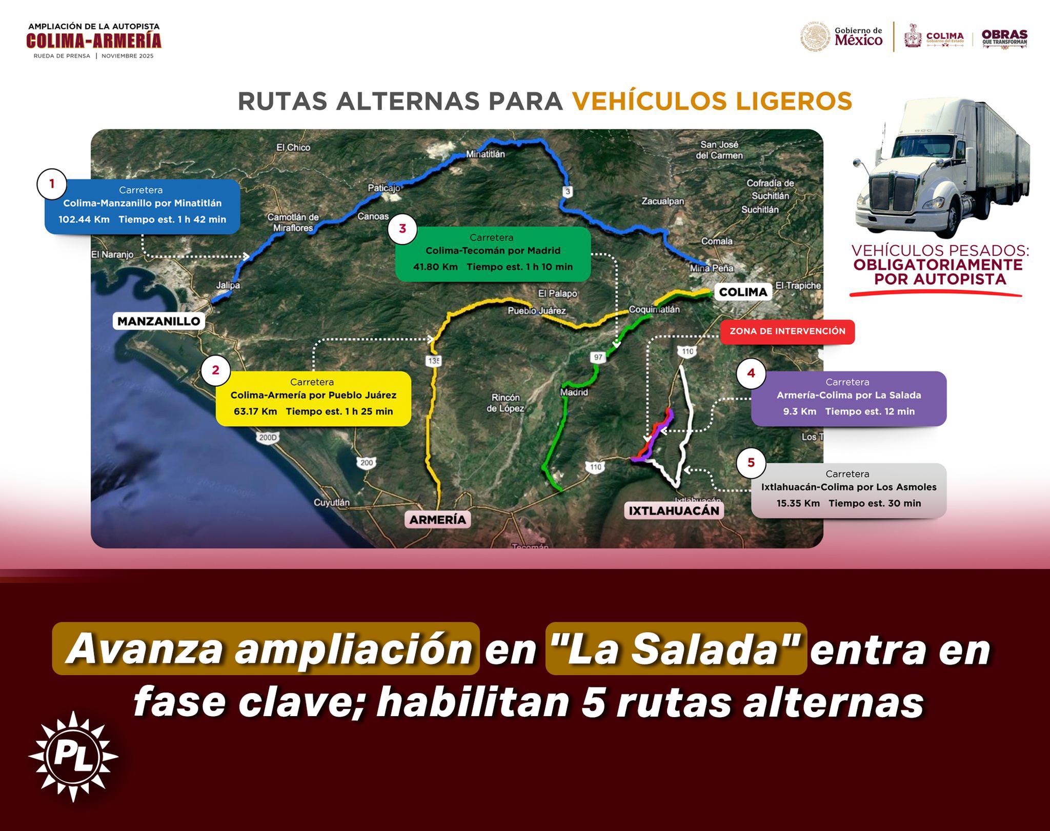 Para mantener la movilidad segura, se activaron cinco rutas alternas para vehículos ligeros, mientras continúan los trabajos que ampliarán la autopista de 4 a 6 carriles y mejorarán su seguridad vial.