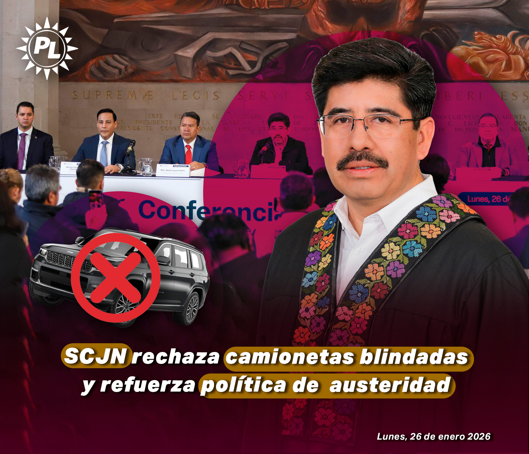 El pleno de la Suprema Corte de Justicia de la Nación determinó no utilizar las nueve camionetas blindadas recientemente adquiridas, como parte de una revisión interna orientada a fortalecer una política de austeridad responsable y un uso más eficiente de los recursos públicos. La decisión fue anunciada por el ministro presidente Hugo Aguilar Ortiz, tras la discusión pública generada por la compra de las unidades.